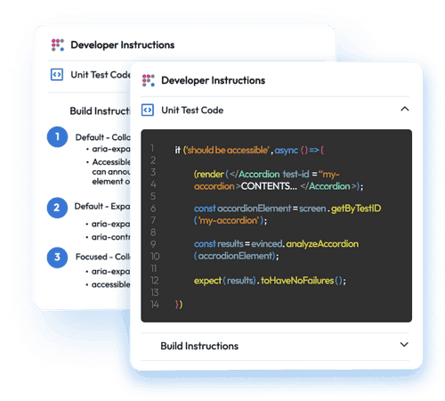 Our plugin for Figma doesn't just help you design accessibly from the get-go. It will also deliver unit tests and other implementation guidance to your developer so that your design is covered for accessibility on both ends.